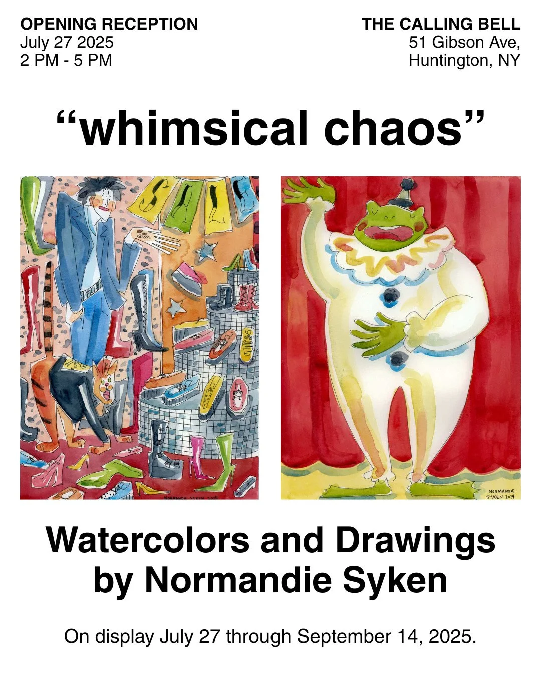 Join us for our opening reception of ‘whimsical chaos’, a solo exhibit of watercolor paintings and illustrations by artist Normandie Syken!